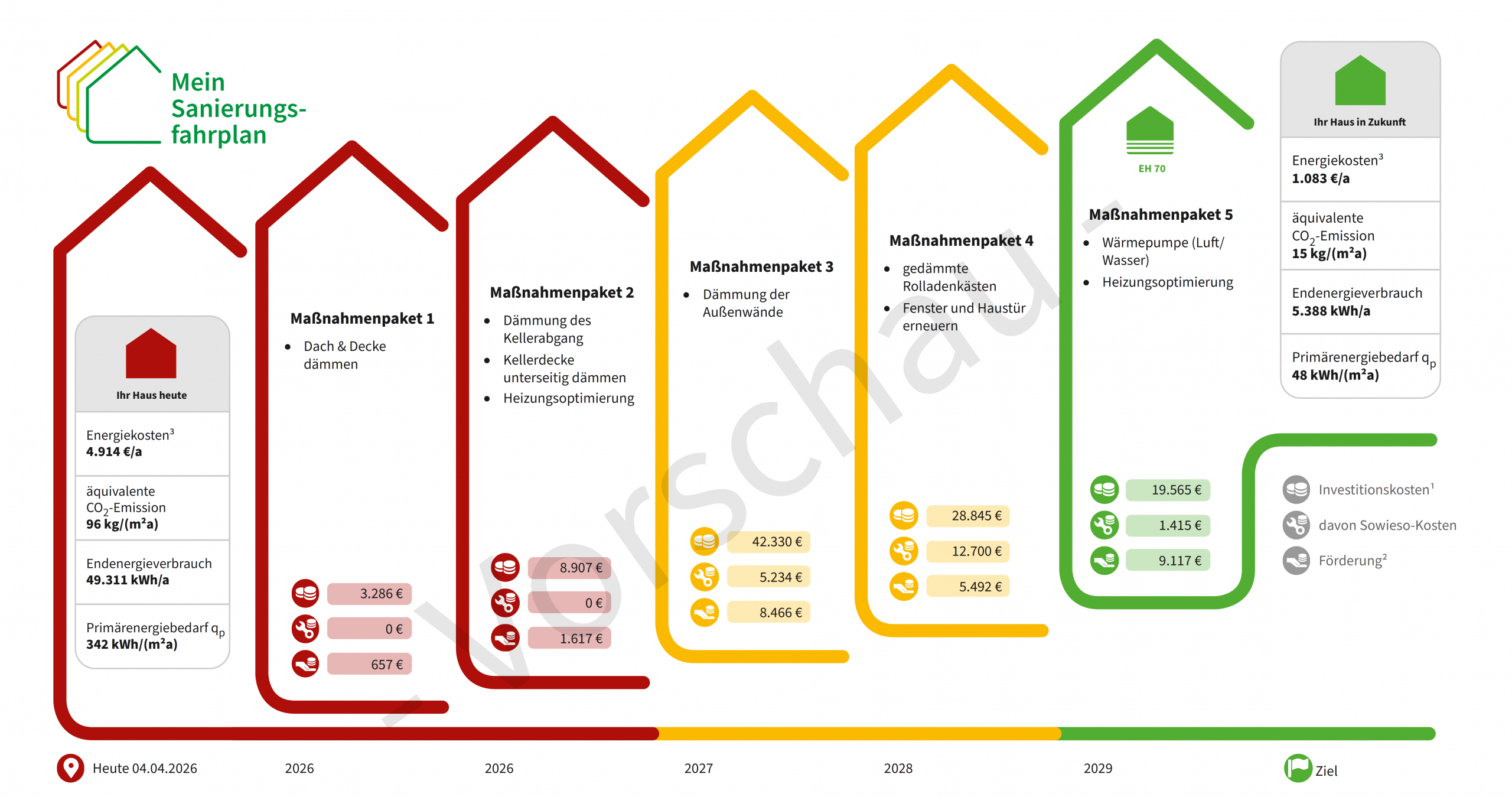 Auf dieser Basis werden passende Sanierungsmaßnahmen entwickelt und in eine sinnvolle Reihenfolge gebracht. Der Sanierungsfahrplan zeigt, welche Schritte sinnvoll sind und wie eine Sanierung auch über mehrere Jahre hinweg geplant werden kann.